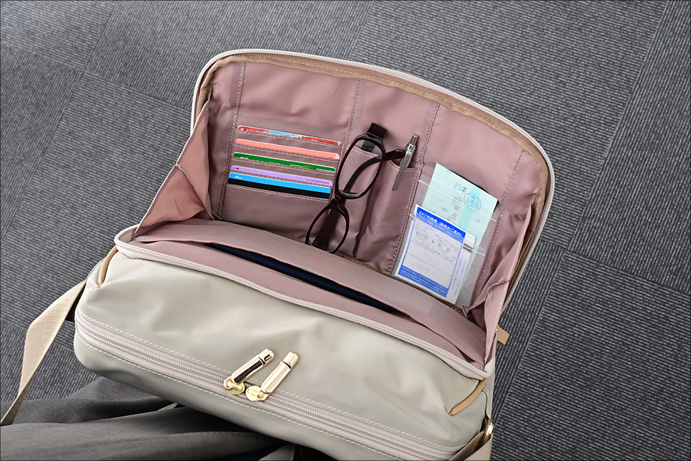対面には、ICカードやクレジットカードを5枚収納できるカードポケット、メガネやペンをさせるポケット、中の切符やチケットが見やすいメッシュポケット、と細かなものが収納できるポケットが並びます。