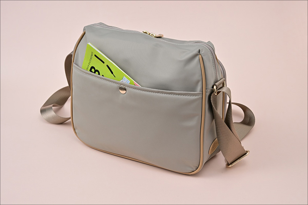 「旅らくショルダー」最大の特徴である前ポケットは、リング状の引手で開閉が楽。
