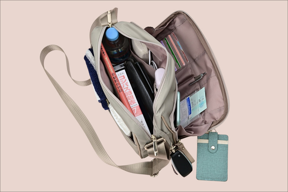 メインポケットは、500㎖のペットボトルを立てて入れられる高さと、長財布を入れられる幅があり、日傘やエコバッグも収納できます。