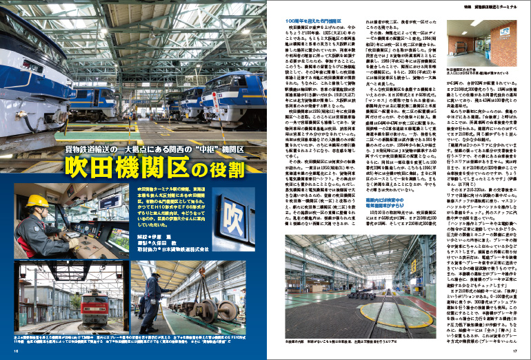 毎年恒例の貨物特集、今回は吹田貨物ターミナルと吹田機関区を徹底解剖! 関西の物流の拠点である吹田タではどのような業務が行われているのか、また、92両もの機関車が配置されている吹田機関区ではどのような検修が行われているのか、配線図などとあわせて詳説します。 そして貨物鉄道輸送を語るうえで外せない機関車としてEF210形式を紹介。2026年で試作車登場から30年です。また、コンテナなどにもよく記載されている「通運」とは? 全国通運にインタビュー取材を行いました。我々の物流を支える、奥深き貨物鉄道輸送の特集です。