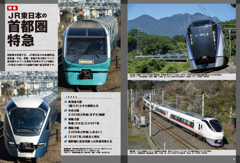 首都圏を発着するJR東日本の在来線特急電車についての特集です。都区内の主要駅を起点に、東海道本線方面・中央本線方面・常磐線方面・房総方面にそれぞれ向かう特急を、進化の歴史や現状の車両などの点から詳解。4方面を結ぶ現役の主力形式の編成表も収録しました。
