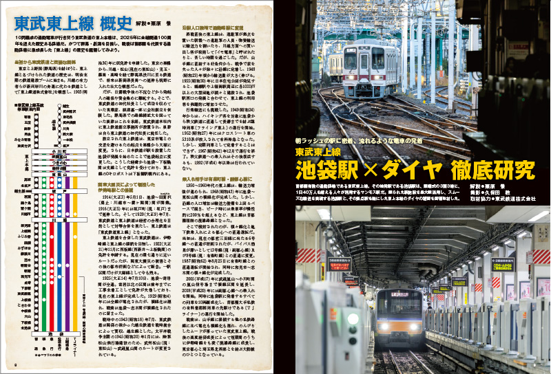 池袋を起点に、川越、坂戸、寄居、越生へと延びる東上線系統。今号では東武鉄道協力のもと、池袋駅の番線捌きを中心に観察し、その洗練されたダイヤを研究しました。