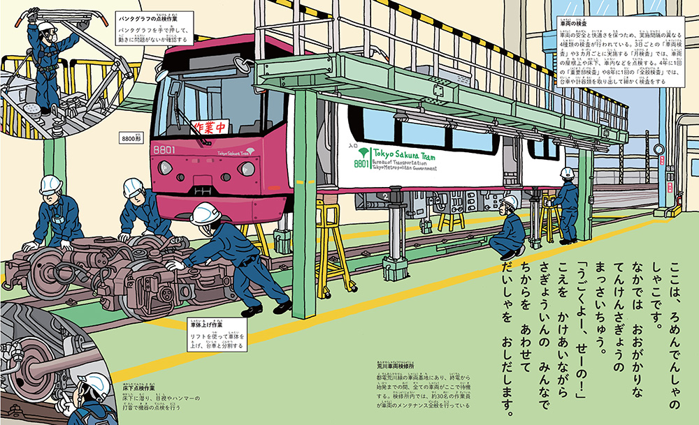 線路を走る電車とは違う車内設備、道路に設置された路面電車専用の信号、車両基地で行われている点検作業の様子など、路面電車の“ひみつ”をご紹介。