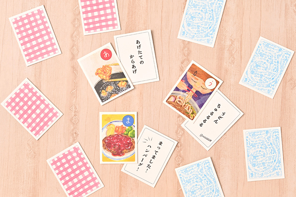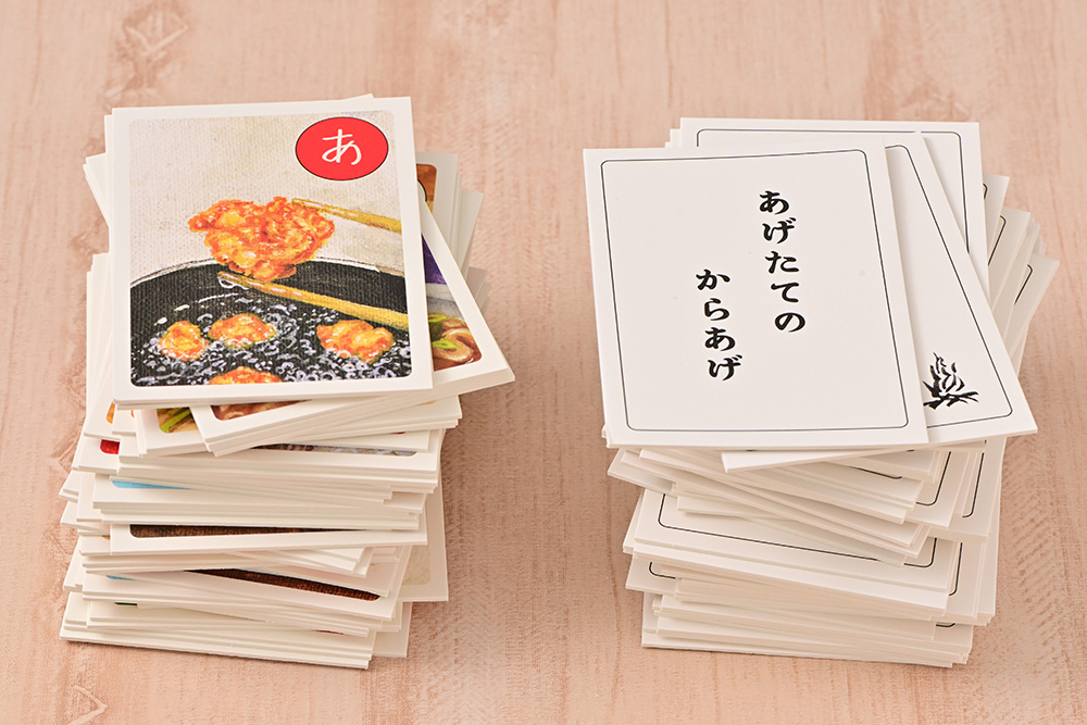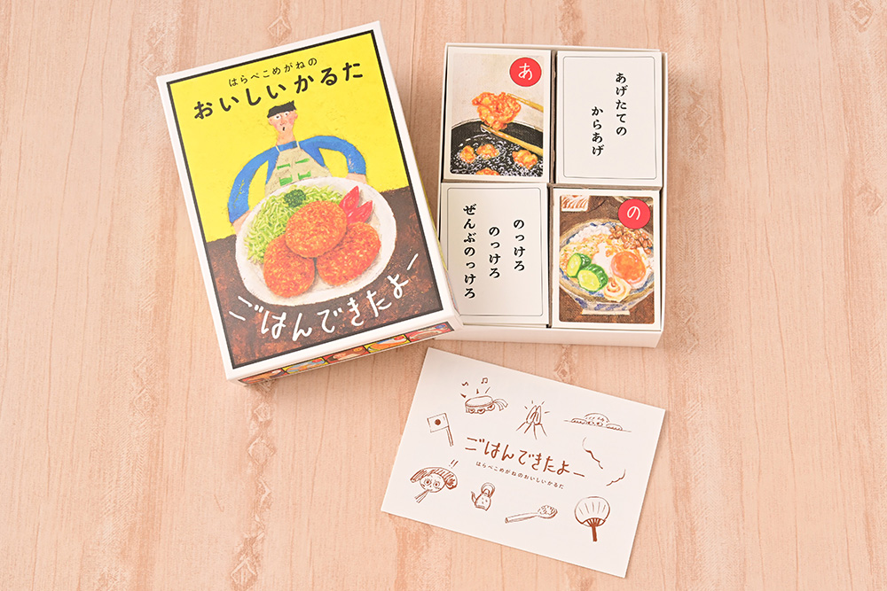 はらぺこめがねの世界観に合った、温かみのあるテイストの紙を採用。厚みがあり、かるた札を混ぜたり取ったりする際に扱いやすいのが特徴です。
