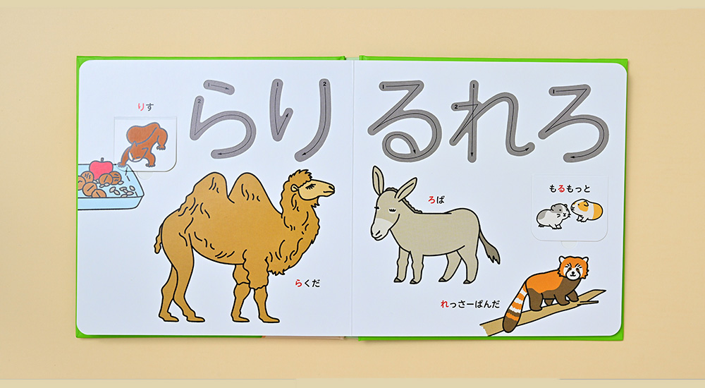 各見開きでは、「う」うま、「き」きりんなど、50音の各文字から始まるどうぶつをかわいいイラストでご紹介。