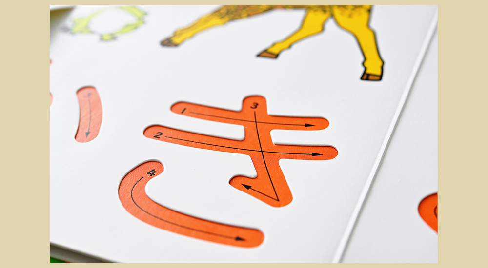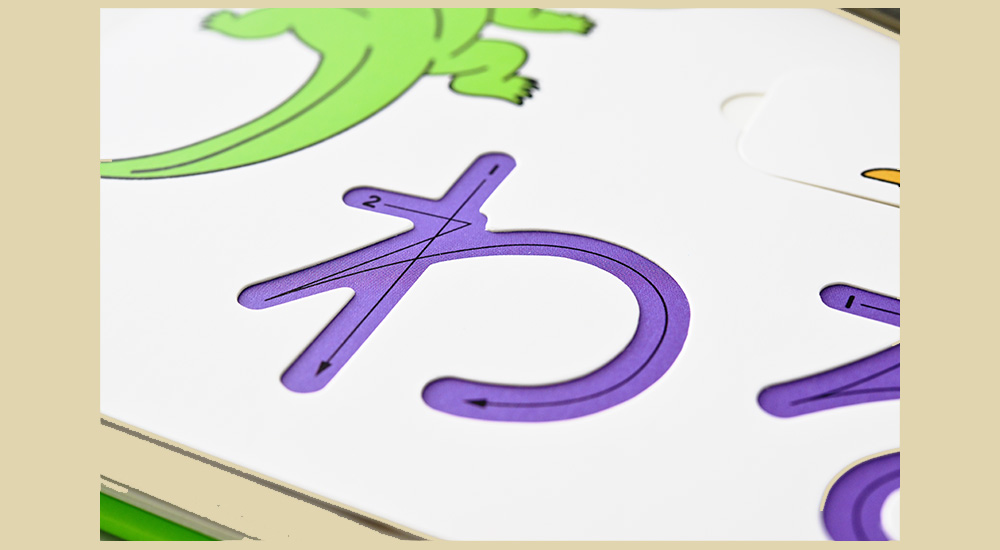 大きく書かれたひらがなの文字には、なぞりやすい溝がついています。筆順の矢印を参考にしながら指でなぞってみましょう!