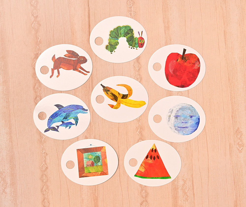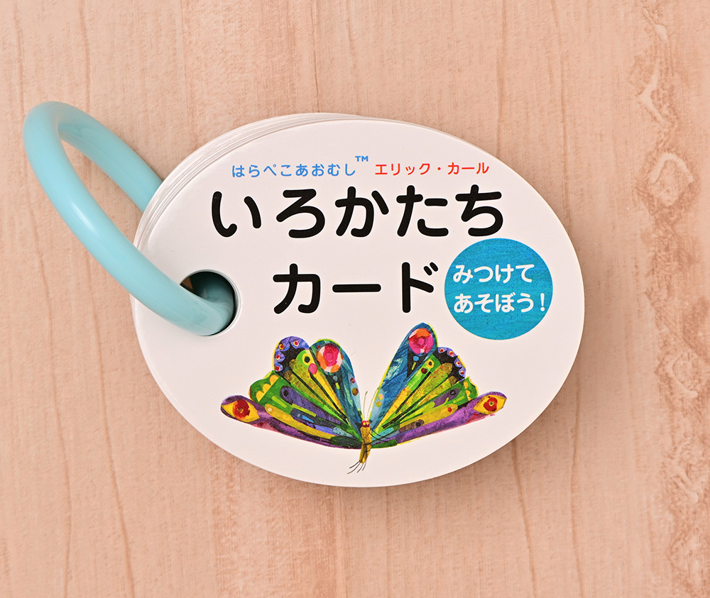 生き物や食べ物、自然や身近な道具など、エリック・カールの美しいイラストや鮮やかなアートで色や形を表現した「いろかたちカード」です。