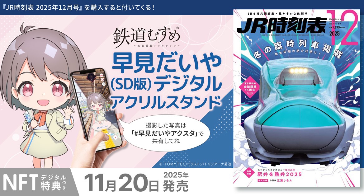 「JR時刻表2025年12月号」発売に合わせ、2025年11月20日~2026年1月12日の期間限定で、「JR時刻表2025年12月号」および「2026 鉄道むすめカレンダー」の特典である「早見だいやデジタルアクリルスタンド」2種と、「『早見だいや』アクリルスタンド」現物各種を用いたSNS投稿キャンペーンを実施します。