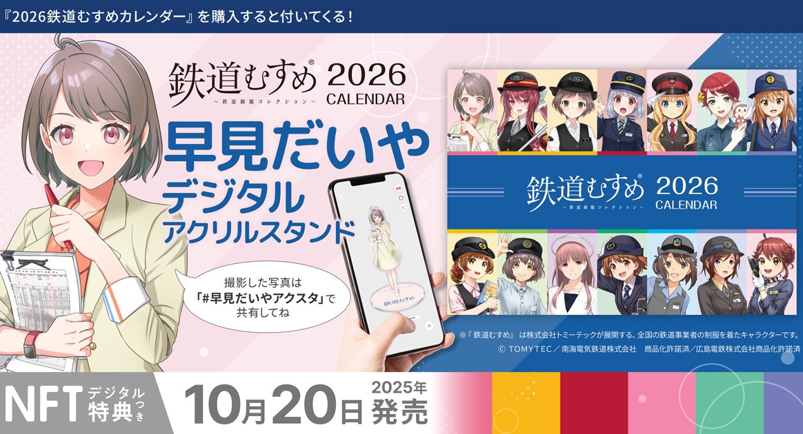 NFTデジタルアクリルスタンドは、好評発売中の「2026 鉄道むすめカレンダー」、2025年11月20日(木)発売の「JR時刻表2025年12月号」の購入特典として付いておりますので、この機会にぜひ商品をご購入いただき、手に入れてください!